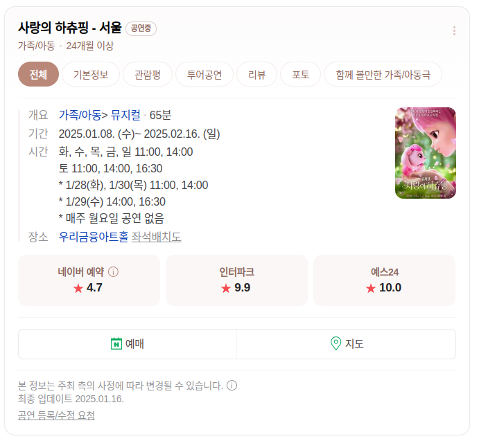 예매는 네이버예매, 인터파크티켓, 예스24에서 가능한데, 할인율은 모두 동일합니다.