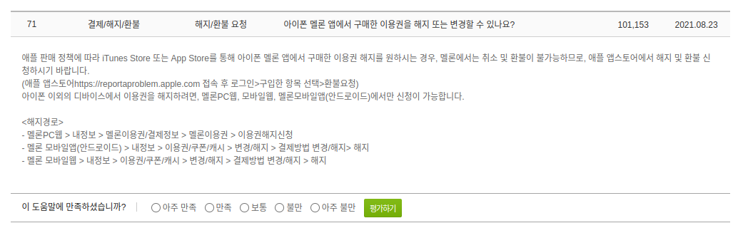 아래는 멜론 고객센터의 '자주하는 질문'에 나와있는 내용입니다.
