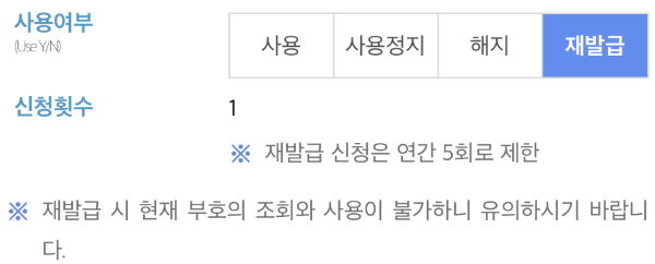 수정을 누른 뒤 페이지 중간에 보시면 '사용여부' 라는 칸이 있습니다. 여기에서 재발급 을 선택후 저장을 해주세요.