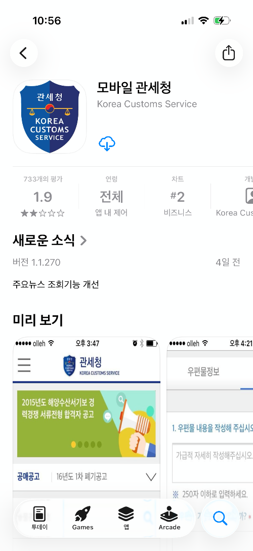 앱스토어 또는 플레이스토어에서 '모바일 관세청' 앱을 다운받아 설치합니다.