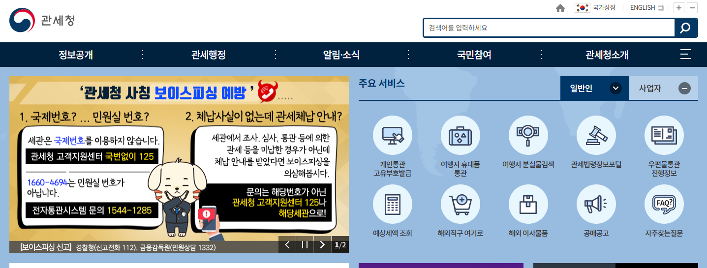 먼저 관세청 홈페이지에 접속합니다. (https://www.customs.go.kr/)